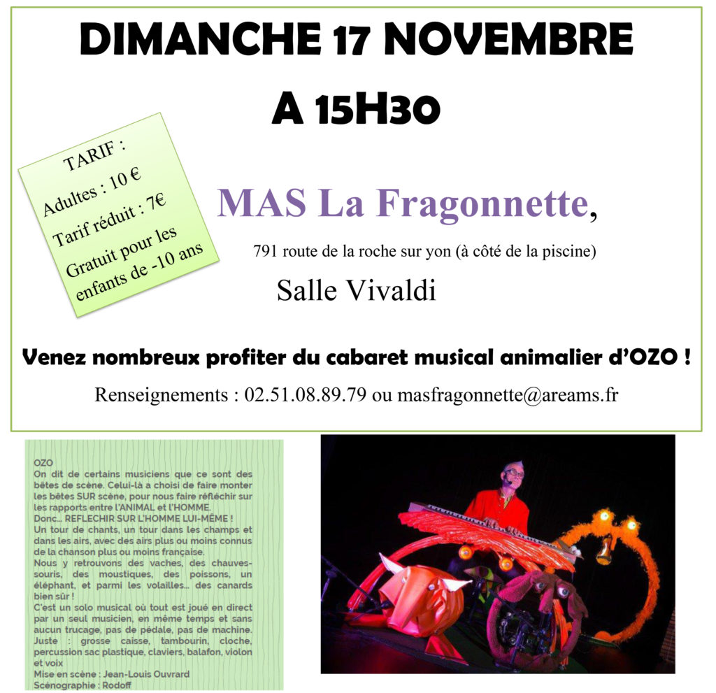 LA MAS propose un spectacle ouvert à tous octobre 7, 2019 Le dimanche 17 novembre prochain, la MAS la Fragonnette sera le lieu de représentation du cabaret musical animalier d’OZO. Ce spectacle est proposé aux résidants de la MAS et à toute personne extérieure qui souhaiterait profiter de l’événement. Ce projet s’inscrit dans le cadre de la 20ème édition du festival « DU COTE D’CHEZ TOI» proposé par l’association « Les pieds dans l’plat ». Le principe consiste à ouvrir son « chez soi » à un public venu profiter d’un spectacle, et se retrouver ensuite autour d’un buffet convivial. Moment culturel, d’échange et de partage où se côtoient personnes valides et personnes en situation de handicap. C’est une formidable occasion de faire tomber les préjugés et de faire évoluer le regard sur le handicap. Venez nombreux, petits et grands, profiter du spectacle « Ozo – le cabaret animalier ». Dimanche 17 novembre à 15 h 30 – Tarifs : 10 € adulte, 7 € tarif réduit, gratuit pour les moins de 10 ans. Renseignements et réservations : 02.51.08.89.79 ou masfragonnette@areams.fr Théatre animalier MAS AREAMS Tweet Navigation de l’article Ouverture d’un Point Conseil BudgetSignature du nouveau CPOM AREAMS, ARS et Conseil départemental