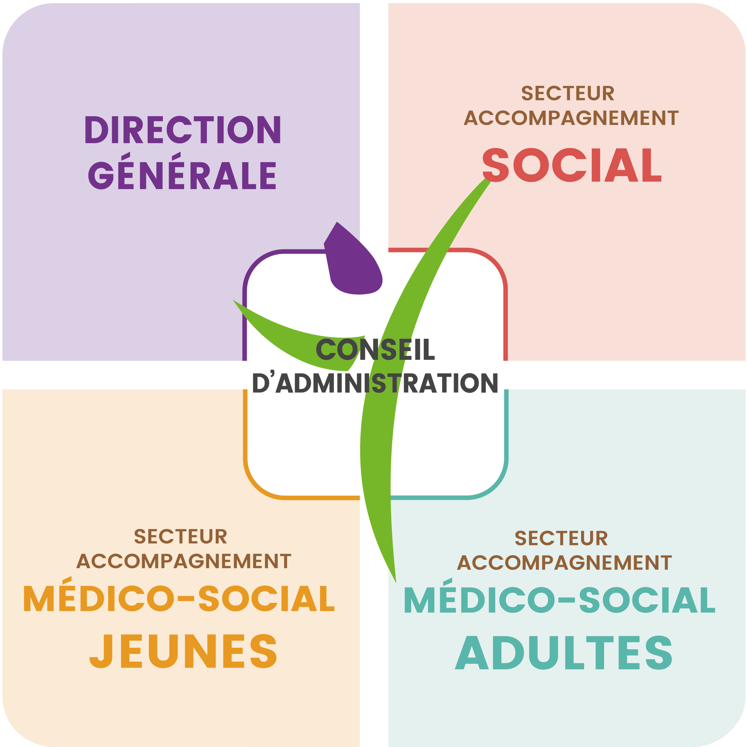 Un Conseil actif et participatif L’AREAMS s’appuie sur un conseil d’administration et un bureau, composés d’une trentaine de bénévoles responsables dont les actions sont basées sur l’écoute et le conseil, pour gérer l’ensemble associatif, promouvoir des projets et répondre, avec les professionnels, aux attentes des personnes accompagnées. LISTE DES MEMBRES DU CONSEIL D’ADMINISTRATION Juillet 2025 BUREAU M. Loïc PERON – Président Président de la commission « Vie des établissements et services » M. Manuel GUIBERT – Vice-Président M. Jean-Paul MARTIN – Secrétaire Président de la commission « Vie associative » M. Emmanuel GARNON – Trésorier Président de la commission « Finances et Patrimoine » M. René-Pierre CAUMEAU – Secrétaire adjoint M. Didier MONTASSIER – Trésorier adjoint Mme Christiane BEALES-GUERSENT Mme Chantal BIAIS – Présidente de la Commission «Ressources Humaines» Mme Reine DOUIN M. Jacques POIRAUD ADMINISTRATEURS M. Jean-Louis BATIOT M. Bernard CHIFFOLEAU M. Andy FAVROU M. Damien GUILMENT M. André GUITTOT M. Jean-Pierre LELOUP Mme Patricia MURAIL-GENTREAU Mme Tiffany SULPICE Une organisation en 3 secteurs L’organigramme de l’AREAMS est composé en 3 secteurs : 🟨 Secteur accompagnement MÉDICO-SOCIAL JEUNES 🟩 Secteur accompagnement MÉDICO-SOCIAL ADULTES 🟥 Secteur accompagnement SOCIAL Organigramme AREAMS_MAJ Octobre 2025