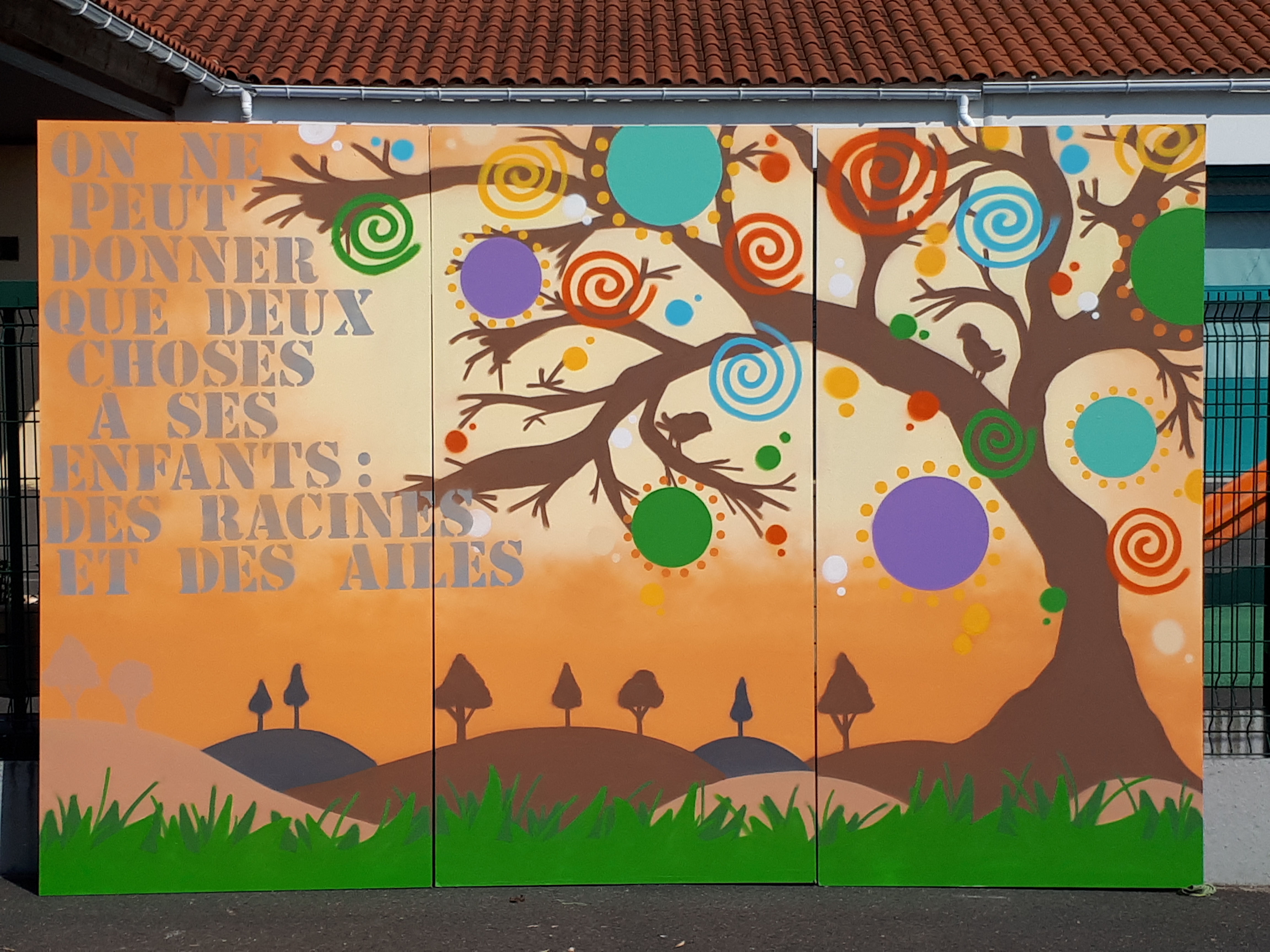 Un atelier « Graff » pour travailler l’expression et la confiance en soi juin 14, 2019 Au premier semestre 2019, l’équipe AED Nord a organisé un atelier Graff avec 5 adolescents âgés de 15 à 17 ans en risque ou en rupture scolaire et rencontrant des problématiques familiales et sociales diverses. Une fresque collective a été réalisée avec l’aide d’un graffeur professionnel. Elle représente un arbre de vie accompagné d’une citation : « On ne peut donner que deux choses à ses enfants : des racines et des ailes ». Les adolescents se sont également exprimés sur des toiles individuelles et ont appris à développer une créativité à partir des techniques du graff. Cette action a permis aux jeunes de s’inscrire dans une activité de plusieurs jours, de réaliser des rencontres riches, et pour certains de retrouver envie et confiance pour s’engager vers de futurs projets (scolarité, formation professionnelle…). La fresque collective est affichée dans un salon d’entretien à l’antenne SSMO à Boufféré. Tweet Navigation de l’article Projection au cinéma du film des jeunes de l’IMEUn « Apéro parents » organisé par le Service d’accompagnement à la vie Sociale